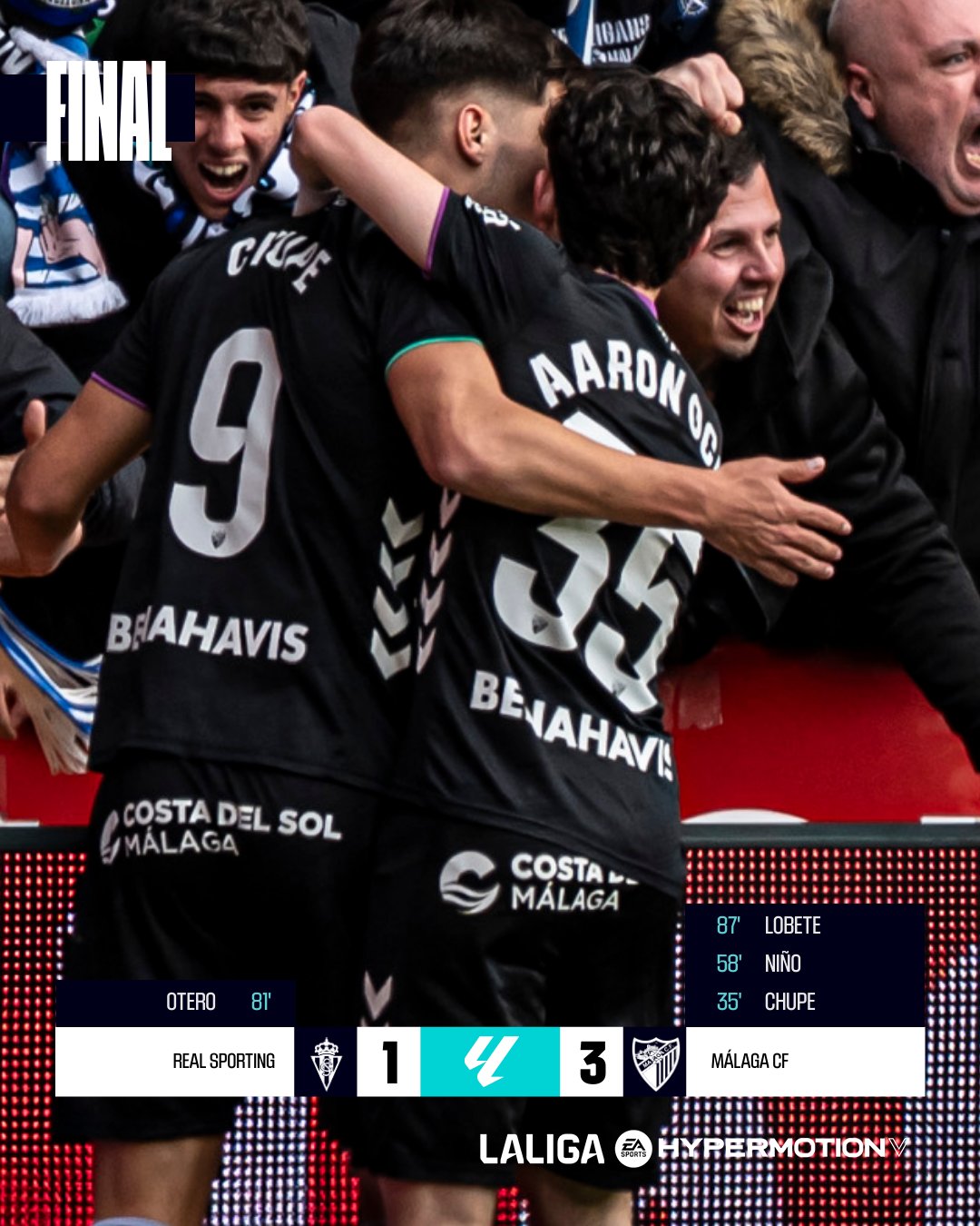 Inicio de año a lo grande del año 2026 para el Málaga CF. Nada menos que una clara victoria( 1-3 ) en casa del Sporting de Gijón, con un Molinón lleno( 22.178 espectadores ) y en día de celebraciones históricas para los asturianos. El encuentro fue excelente con un planteamiento arriesgado pero efectivo con dos hombres en ataque desde el comienzo. Marcaron los goles Chupete, Adrián Niño y Lobete. Esta victoria sigue encumbrando al técnico Funes, con 6 partidos jugados y sin perder. Y llega a la tercera victoria consecutiva.- Suma 14 de 18 puntos y con el score de 29 está a solo un punto del playoff de ascenso. Sin duda, el mejor momento de la temporada para el equipo blanquiazul.